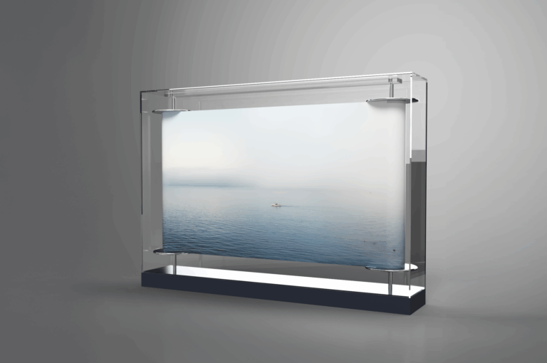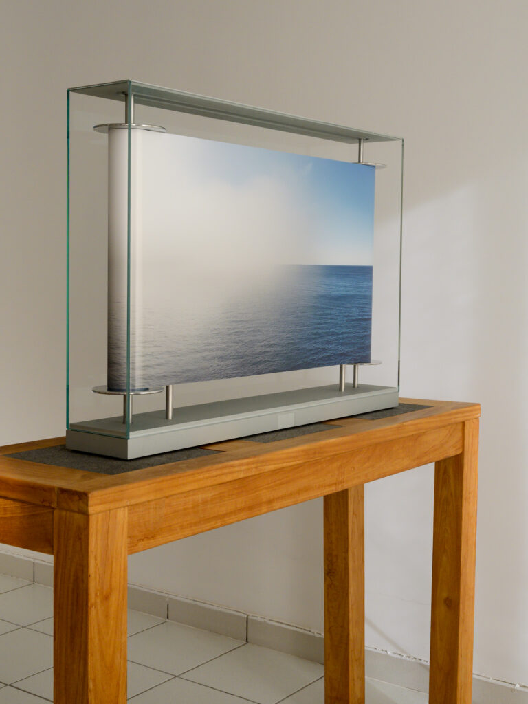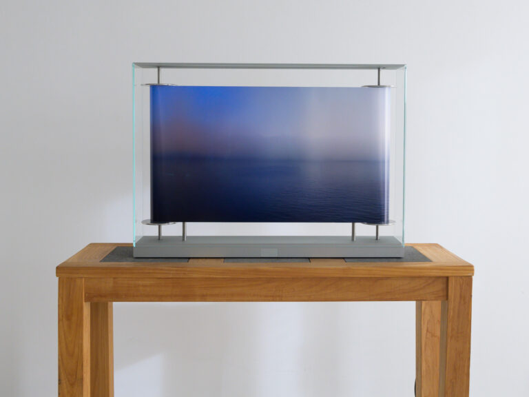 Alliant ingénierie de précision et poésie de l’image, l’horloge photographique emprunte autant à la mécanique qu’à l’art cinétique. Elle fait défiler la photographie dans un imperceptible mouvement, révélant uniquement la portion du paysage correspondant au moment présent.