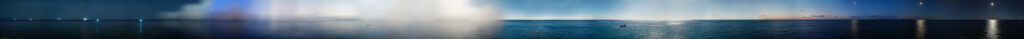 Cette œuvre transforme une journée entière en une seule image continue. Sur douze mètres de long, l’image tisse ensemble vingt-quatre heures d’un paysage saisies depuis un point fixe. Ici, le panoramique devient durée : il ne se déploie plus dans l’espace, mais dans le temps lui-même. En choisissant d’ancrer l’œuvre dans un paysage marin – scène naturelle liquide en perpétuel mouvement – je propose une allégorie de la fluidité temporelle et de l’impermanence de toute chose. L’installation questionne la logique du « moment décisif » qui a longtemps façonné l’histoire de la photographie. Au lieu de figer un instant, elle révèle un flux continu, où chaque heure s’entrelace à la suivante.